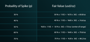 The current fair value is calculated as a weighted average between two market conditions by multiplying the probability of an increase (35%) by the higher price (110 per ounce) plus the probability of a return to the economic price (40 dollars) multiplied by the probability of this scenario occurring (65%) in this case. This is to simplify the mathematics.
