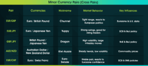 Minor currency pairs or cross pairs are the pairs that do not include the U.S. dollar.